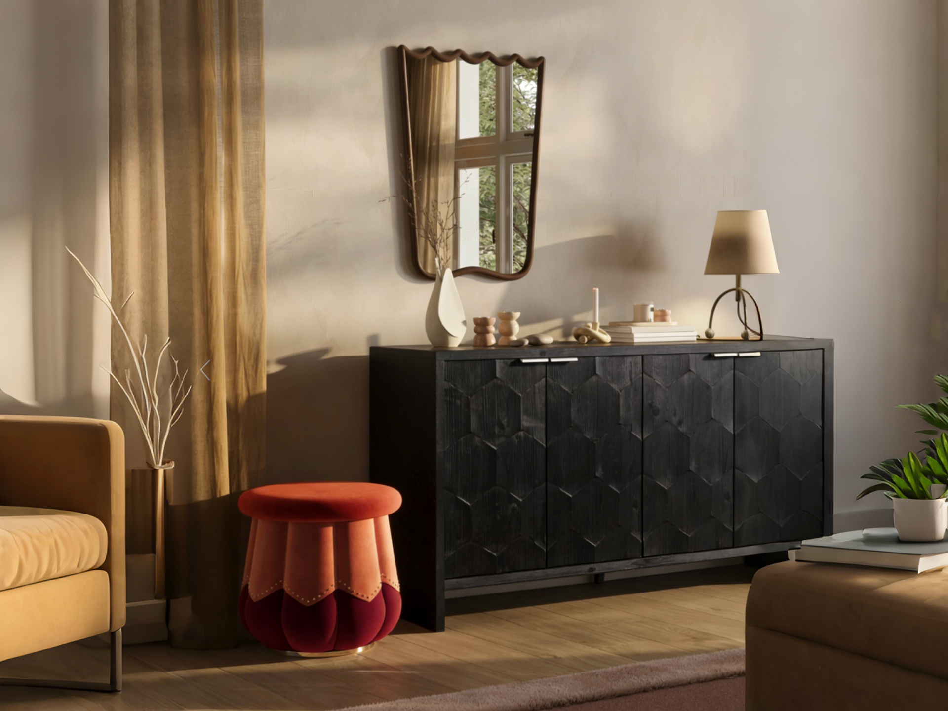 This coffee table features a smooth, matte black finish that is warm to the touch, scratch-resistant, and durable. Under light, it displays a soft, matte sheen and complements various interior design color schemes.